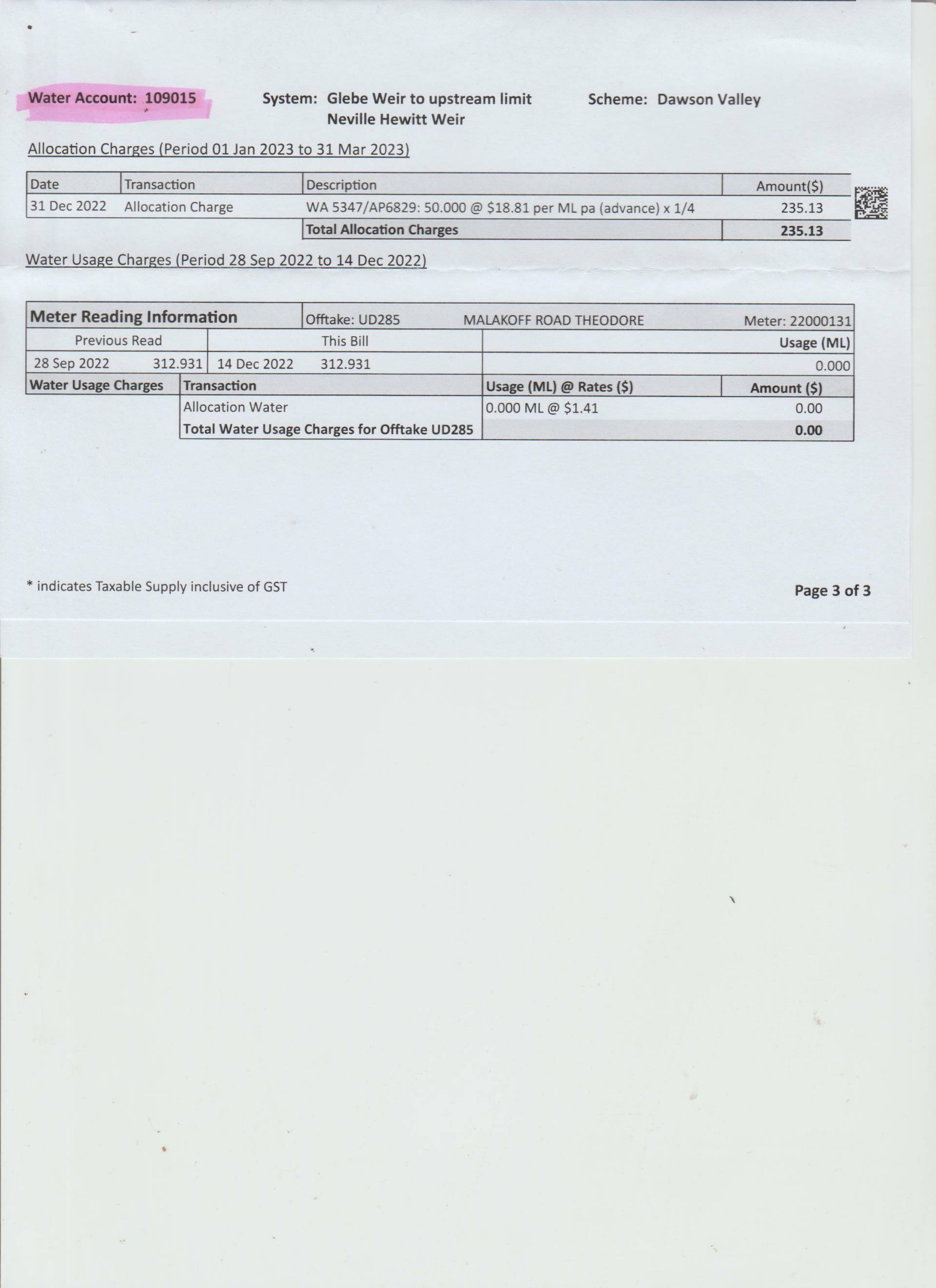 Council rates are approx $630/half year. Water is supplied by the Dawson Valley Scheme at a quarterly fee and rate per KL as per photo.